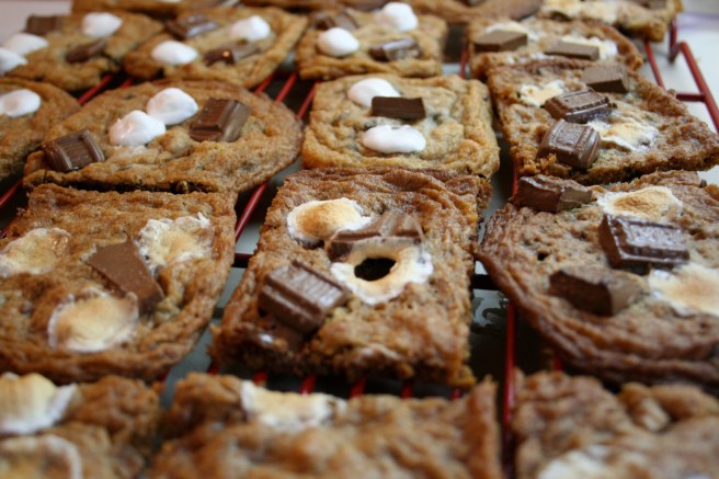 I stumbled on the recipe for these delicious cookies on what promises to be one of my favourite future blogs, Baked Perfection. I made the cookies a bit larger than what was originally proposed on the blog, and the end result was a single, gigantic pizza-like cookie, which had to be sliced into cute little rectangles of deliciousness. The best part of this cookie-making extravaganza? I have loads of leftover s’mores ingredients, so I will be eating this campfire dessert every night for the next month.