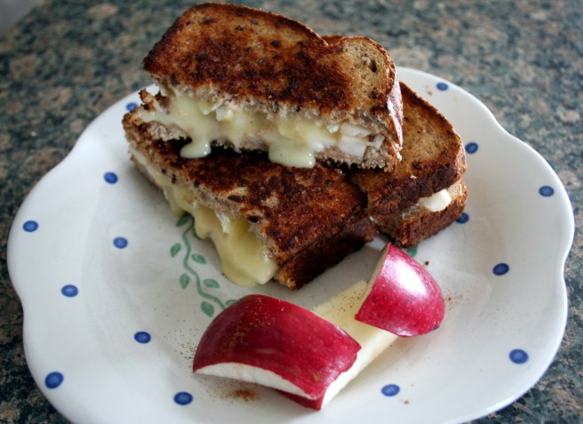Inspired a few weeks ago by the delicious apple brie panini I had in Ottawa’s Glebe neighbourhood, I promised myself I would make my very own version of this awesome lunch food. Being too poor/cheap at school to buy a large chunk of brie, I was super happy to find out that we had the biggest piece in our fridge at home. With said piece of cheese in mind, here is what I had for lunch today… I’m working on the food photography skills, bear with me…