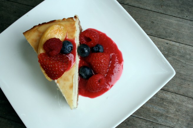 Having this be only the second cheesecake I’ve ever made, I was once more concerned about my lack of water-bath for cooking the cake. I cranked my oven down to a mere 275° F, and cooked the cheesecake for 3/4 of the required time. Perhaps I should be more modest, but the cake turned out perfectly. There was not a SINGLE crack, nor bubble in the top of the cheesecake. I am extremely pleased. Also, it didn’t taste too much like white chocolate, which pleasantly surprised me, since I’m more of a milk chocolate girl. With patience on my side for once, I let the cheesecake cool completely before lovingly cutting into the cake to prepare it for pictures. The results, I think, are quite pretty…