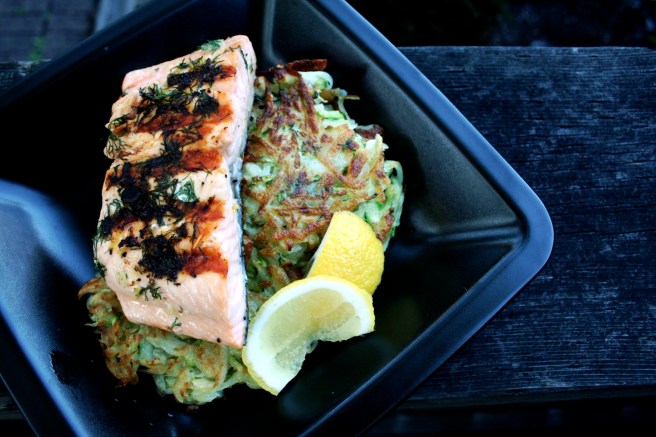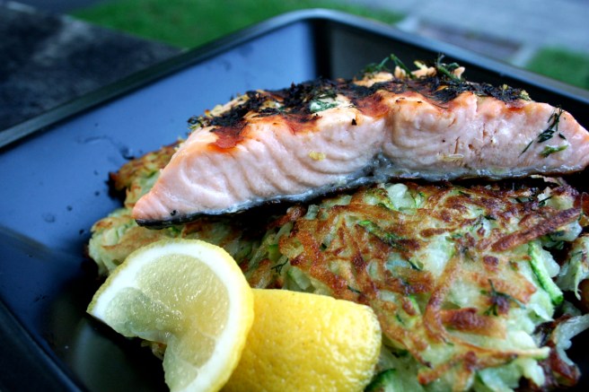 With the clock quickly ticking on my friend Gord’s blogger challenge, I knew that last night was as good a time as any to complete my task. Just to remind you all, my challenge was to take one of Gord’s recipes and make it my own. This being said, I decided to take his “Cheddar Zucchini Patties” post and ditch the cheese in favour of a hefty amount of grated potato and chopped dill. I must admit, I can’t take total credit for this idea, and was inspired (as always) by the Canadian Living recipe for Mini Potato Zucchini Latkes. I first saw this recipe in the mini cookbook that accompanied September’s issue of the magazine, which my mom very dearly supplied me with when she visited last week. The only major alteration I made to the recipe was to add two tablespoons of finely chopped dill, to add some sort of consistent flavour to my meal. These latkes turned out pretty well, however I think I definitely could have benefitted from cooking them a bit longer, as the insides still had a bit of a munchy consistency. Overall, these latkes provided the perfect accompaniment to my salmon, completed a chellenge and were the best “dinner food that reminds me of a breakfast meal” that I’ve had in a while.