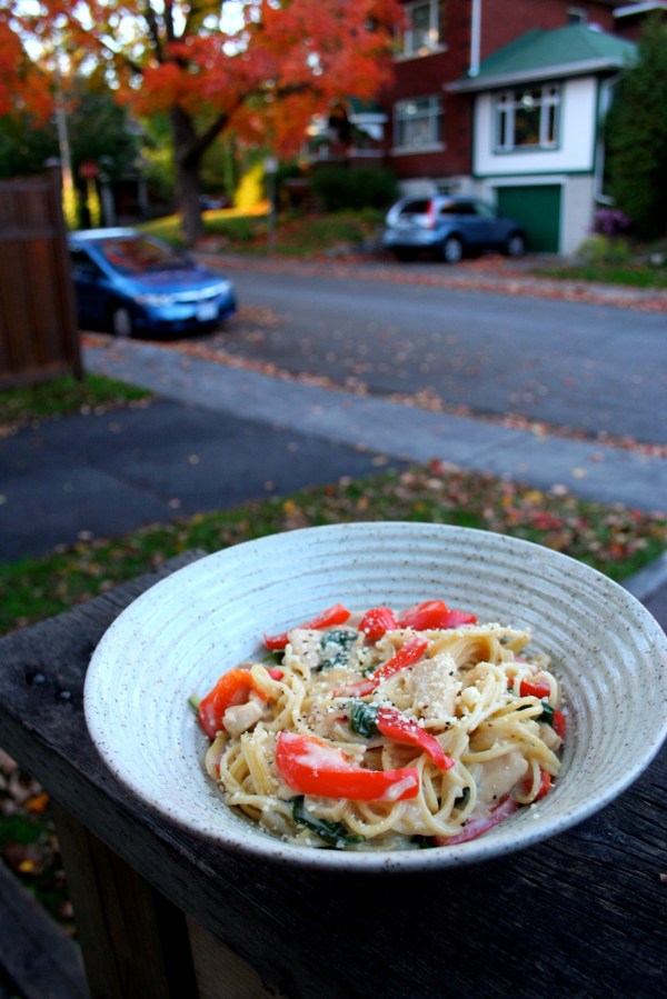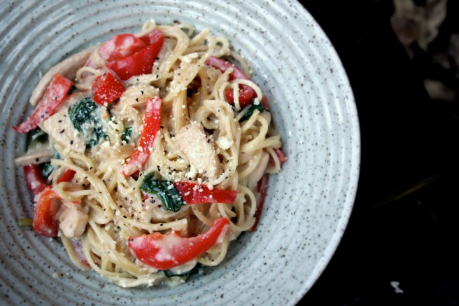 Inside the sauce was chopped red pepper, baby spinach, onion, garlic and chicken (hence the con pollo). Overall, this pasta dish was really easy to make and produced some extremely satisfying leftovers (seriously, all I’ve eaten in the past 24 hours has been this pasta, it makes about four servings).