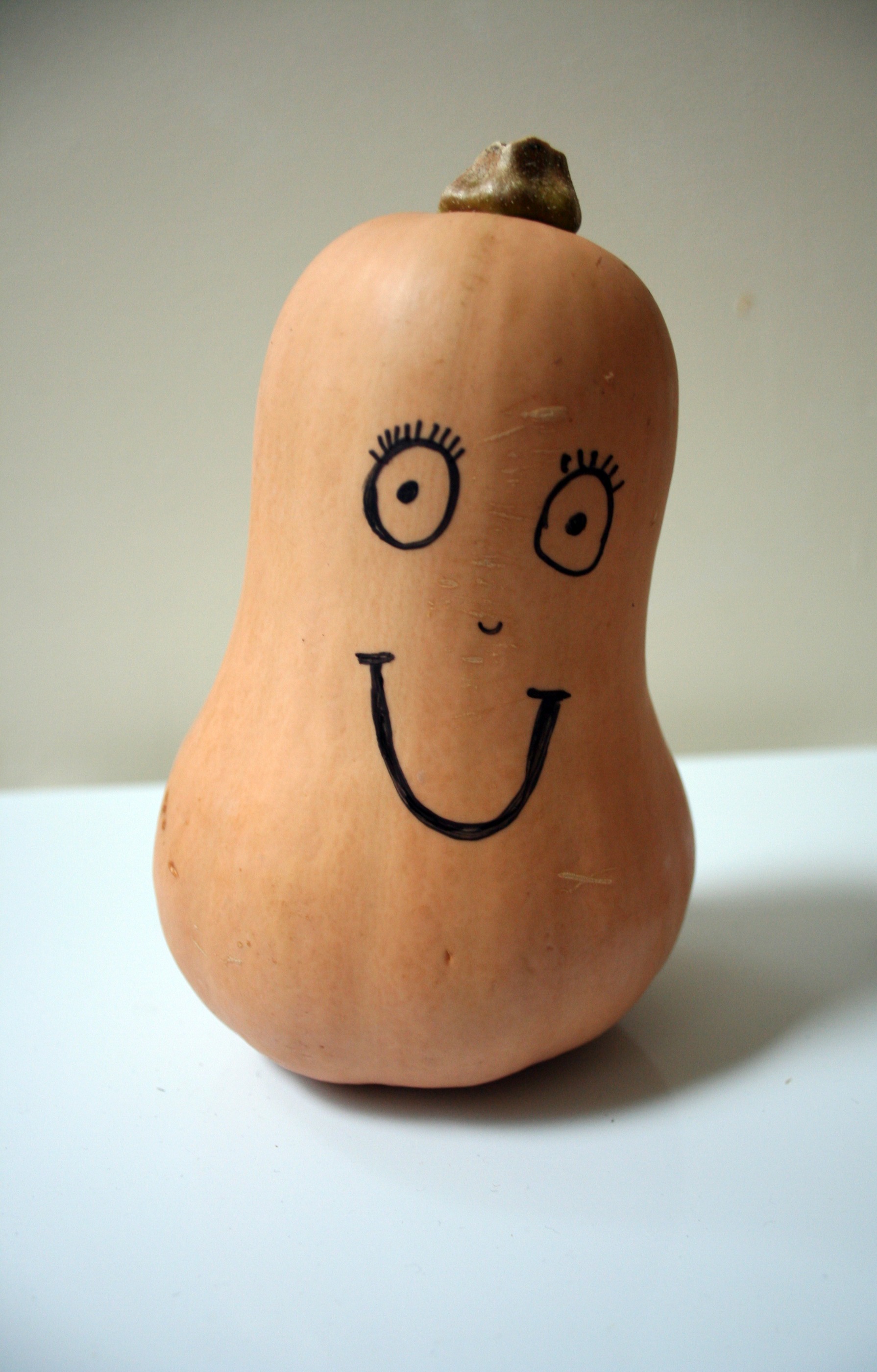 Now that we’ve been distracted momentarily by Ramsay’s dreamy British accent, let me resume discussing this squash.  When I went to the grocery store in search of a butternut squash, I wandered around the produce section eventually realizing that I have no idea what it actually looks like.  Once again, my wonderful iPhone saved the day, as I was able to quickly google pictures of this strange vegetable (or is it a fruit because it has seeds?  The verdict is still out).  Once I got home, I had this gigantic desire to draw a face on the squash.  I do not know why…these bizarre thoughts just sort of come to me sometimes.  Anyways, the result was the picture below.  I almost drew a face on Brittany’s to make my squash a husband, but I don’t think that would have bode too well for me…