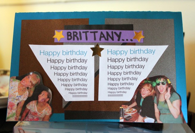 I tried (and perhaps failed) to make this card as rad as Britt’s personality. She’s into the whole rock and roll thing, and thought that sparkly paper from The Papery would suffice in meshing this musical genre into birthday card form. There’s also some groovy, multi-coloured sparkle paper on the inside, so you’ll just have to trust me when I say it was wicked.