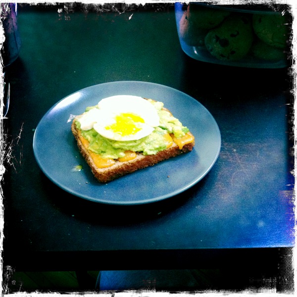1: Breakfast. Toast with old cheddar, avocado and a poached egg. I realize it looks like Shrek exploded on my bread, but it was delicious. Don’t judge a breakfast by its icky green colour.