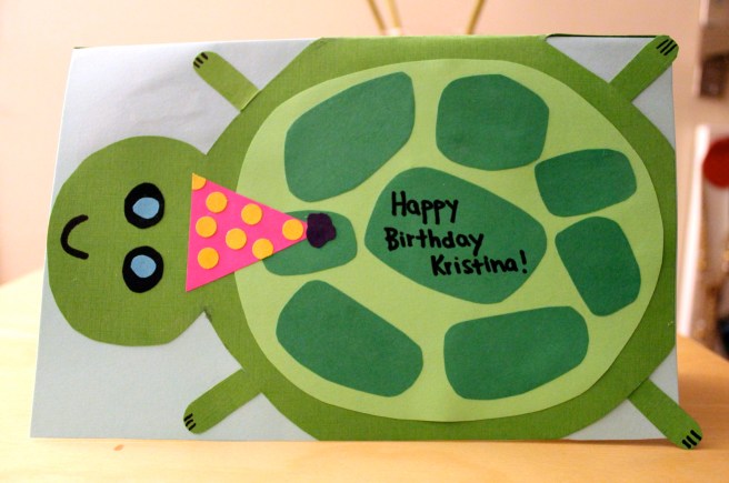 Kristina was one of the fantastic people that I worked with this past summer at Carleton’s Student Experience Office. We had a series of inside jokes involving turtles eating things (google image it, cutest thing ever), and this card pays tribute to those weird (but hilarious) exchanges. Last year Kristina’s belated birthday card had a penguin wearing a tuxedo on it. Clearly we’re starting some sort of animal pattern here.