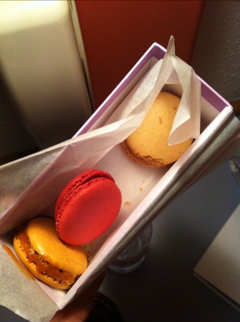 Finally, no trip to Laduree (or Paris, I daresay) is complete without the purchase and prompt consumption of several macarons. Nat and I got a box of six (she ate one, I ate five). The last picture does not do the gorgeous-ness of them justice, as it was taken by the light of my lamp in my hostel room. Better pictures on my real camera, if only I could access them…