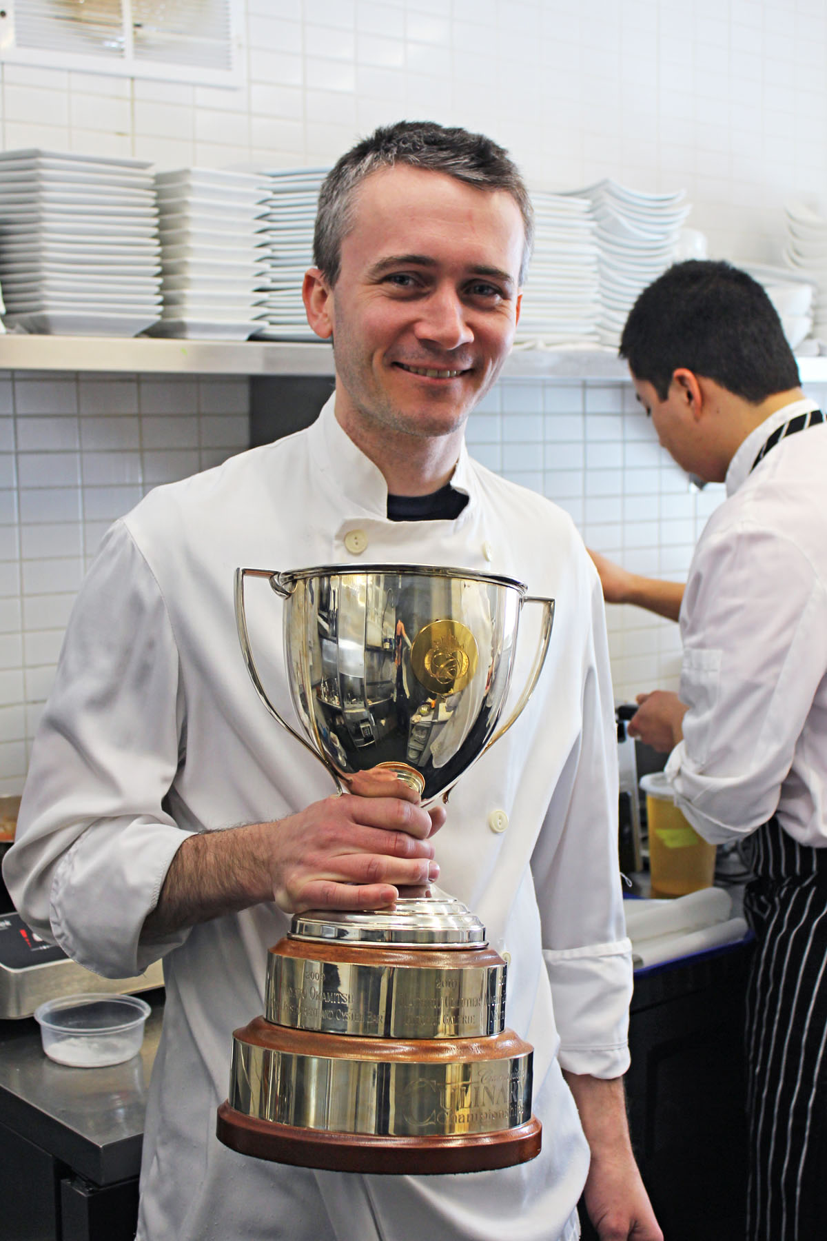 Despite recent culinary wins, Chef Lepine is still incredibly down to earth. He offers me a mug of green tea to match his own and we sit near the front window of his gastronomy kingdom, Atelier. When I ask to take pictures, he self-consciously points at a small brown stain on the front of his otherwise pristine chef jacket. I tell him to hold his restaurant’s Holy Grail – the large Canadian Culinary Championships trophy – in front of it. It works.