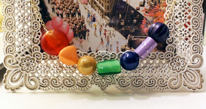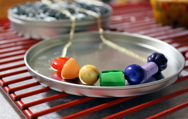 Since I’m not really one to do anything sans colour, I decided my version would be inspired by the seven colours of the rainbow. Mr. Roy G. Biv himself (did your mom ever teach you that trick to remember the colour order? red, orange, yellow, green, blue, indigo and violet. Now you know). Since I didn’t have the time or money to buy seven different colours of clay (though I do love the medium), I did the next best thing – took a trip to The Sassy Bead Co! I love this place. Mini mason jars filled with every bead imaginable line the walls. Clay beads, glass beads, big beads, little beads… all lie in small velvet boxes on a centre table. Two middle aged women sit by the front window making small talk and tiny beaded flowers.