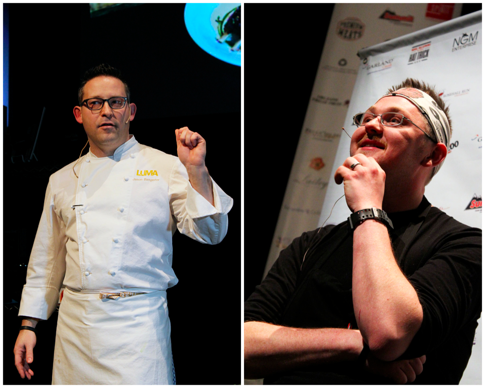 As bloggers, we also got kick ass, second-row seats for the afternoon demo session. That meant that I could take cool, close-up pictures like these without rushing up to the front every two seconds. That’s Chef Jason Bangerter on the left and Chef Jonathan Korecki from Side Door on the right. Recognize Chef Korecki? That’s because he (and his homemade silk-screen-printed bandanas) is a contestant on season two of Top Chef Canada!!! It’s kind of one of my favourite tv shows…