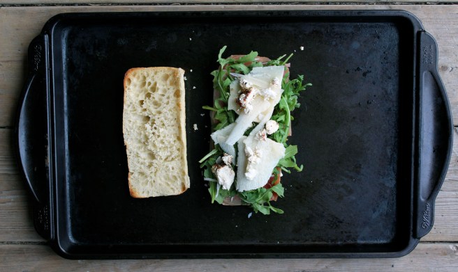 Prosciutto (sheds a succulent, fatty juice upon heating), a fresh panini bun, arugula (king of all greens), a couple of wedges of Parmesan cheese (the likes of which I re-discovered in our fridge’s meat drawer) and a scoop full of creamy, seasoned goat’s cheese (which I have no side comments about).