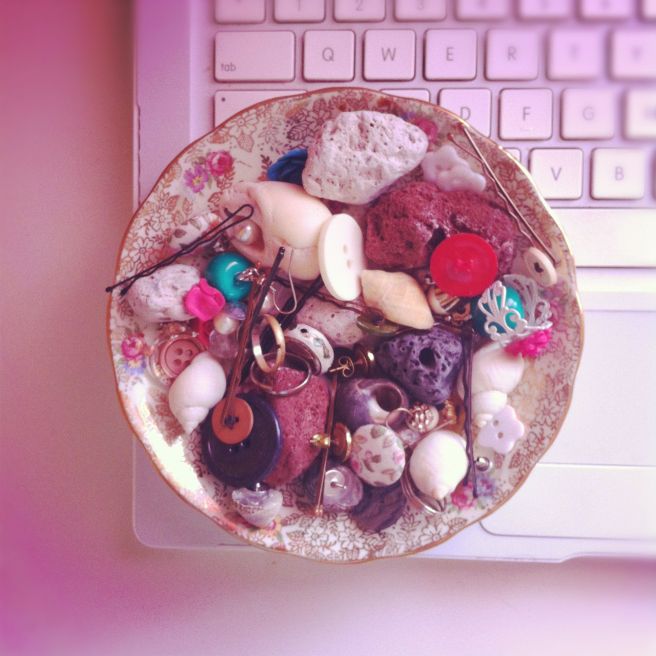 A cute floral saucer that now holds my collection of earrings, volcanic rocks and sea shells.