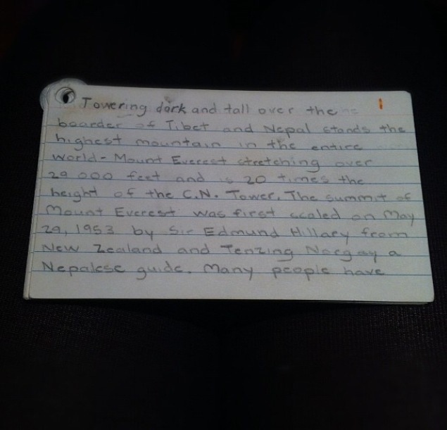 It all culminated in my grade five speech. In elementary school in Ontario, all students were required to develop their public speaking skills in the form of a three to four minute stand up. Speech competitions were serious business: a time to organize back-up cue cards should memorization fail, and practice your time with a microwave countdown. It was also a time for sharing your passions. So I wrote a speech about Everest, using my words to bring my classmates on a journey to the top of the world.
