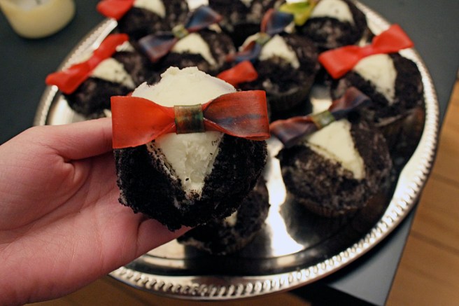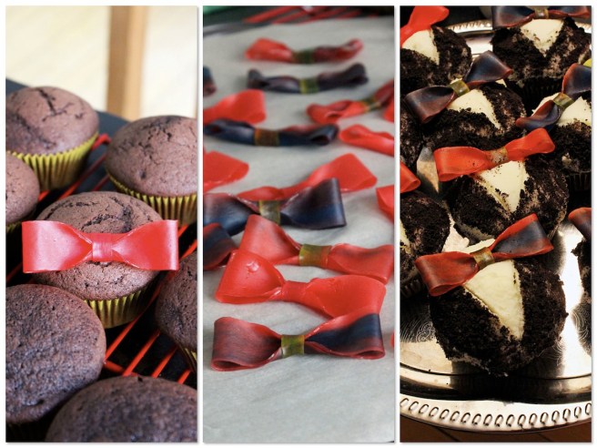 My guardian angel of the week, Martha Stewart, saved the day. One of my searches landed me on her slideshow of fancy cupcakes. I was clicking through photo after photo, bleary eyed and getting increasingly disgusted by the hypothetical pool of drool that was being induced by the pictured cupcakes. Then, just like that, it happened. I found the perfect solution to my problem. It was slide number 18 out of 30. Candy-Bow-Tie Cupcakes. Be still my beating heart.