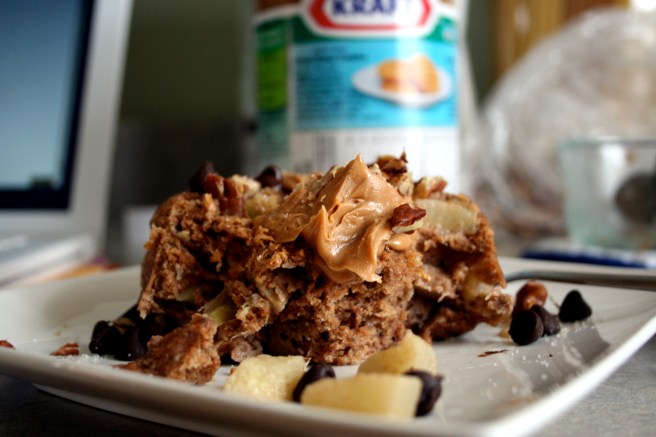 I knew I wanted to include peanut butter and apple in my breakfast bake, so I fiddled around with Britt’s instructions until I got my adapted Hilary recipe. A few key differences involve me using whole wheat flour instead of whole grain flour (this was because I forgot the name of the correct flour in a moment of Bulk Barn panic), my use of normal milk instead of the bizarre I-will-never-buy almond milk, and my addition of chocolate chips as a topping (because COME ON, everything is better with chocolate).