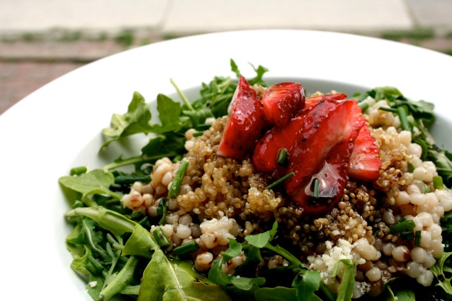 After about 10 minutes in the oven I took it out and, by the glow of a small tea light, spread pesto and goat cheese over my barely-visible pieces of baguette. Thank heavens my strawberries were pre-cut, otherwise it’s highly likely I would have lost a digit. I tossed the strawberries with a bit of balsamic vinegar and carefully added them on top of the goat cheese.